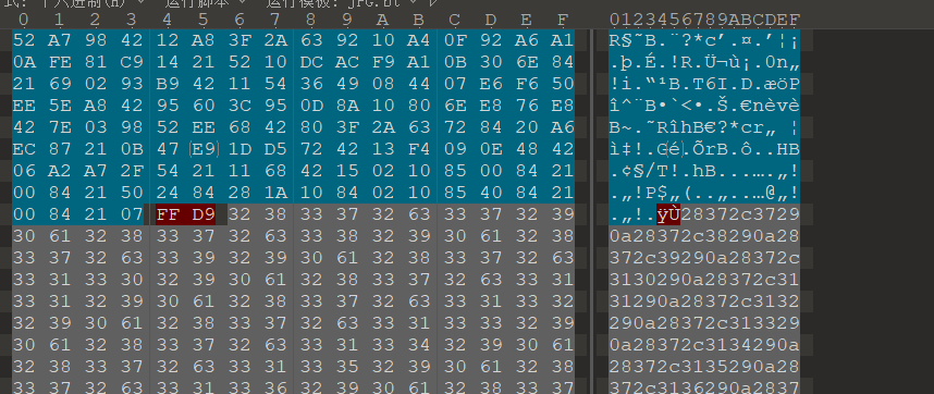 下载又又是图片,emmmm,查看hex看到jpg文件尾发现大量字符串