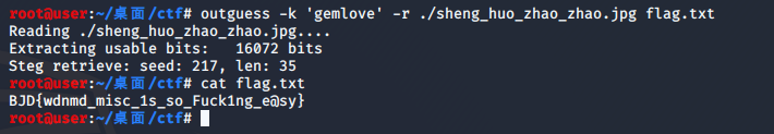 使用命令:outguess -k ‘gemlove’ -r ./sheng_huo_zhao_zhao.jpg flag.txt