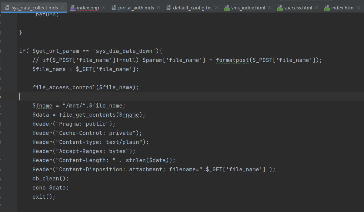 可以看到在index这个php引用了这个文件,触发条件是$get_url_param == ‘sys_dia_data_down’,我们只需要控制这个值进入判断然后给file_name传参就行,其中get_url_param这个变量是来自前端传参,代码块如下: