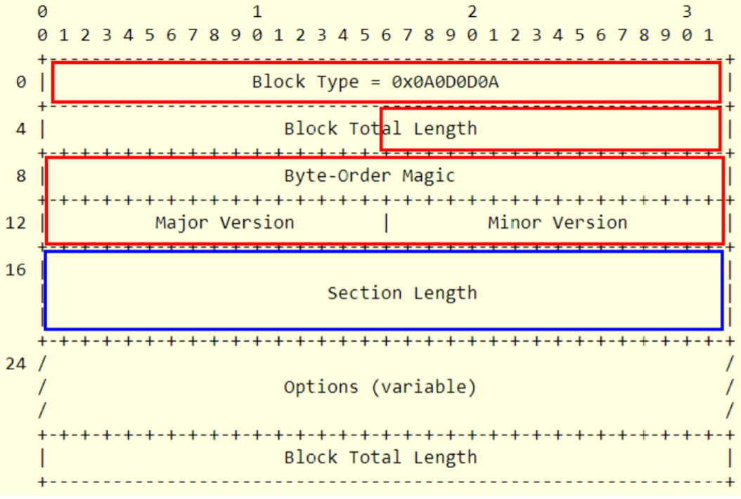 红色部分是固定的:Block Type始终为 0 A0D0D0A;Block Total Length是小端存储的Header