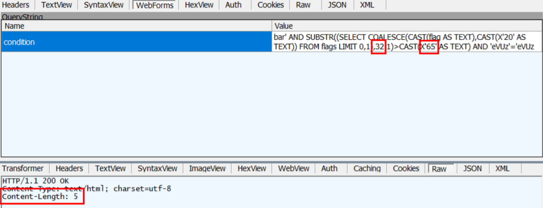例如上述请求在判断flag的第 32 位字符是否大于 0 x 65 ,返回 5 表明结果是否定的。