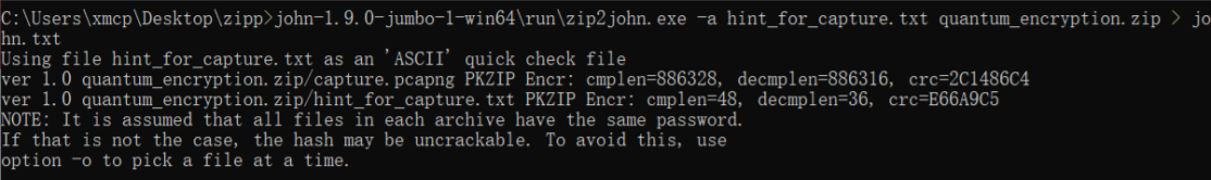 我们需要破解压缩包口令,考虑John the Ripper。首先用zip2john转换一下: