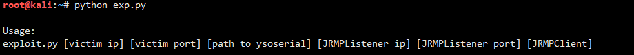 print('\nUsage:\nexploit.py [victim ip] [victim port] [path to ysoserial] '